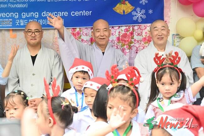 ▲ 명궁데이케어센터에서 열린 크리스마스 파티. 아이들이 덕문스님을 향해 손을 흔들고 있다.