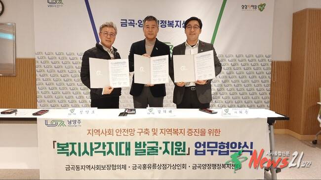 ▲ 사진=남양주시남양주시(시장 주광덕)는 15일 금곡양정행정복지센터가 금곡동 지역사회보장협의체 및 금곡홍유릉상점가상인회와 함께 복지사각지대 발굴 및 취약계층 지원 강화를 위한 업무협약(MOU)을 체결했다고 밝혔다.