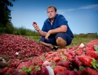 호주 동부의 글래스 하우스 마운틴 농장에서 딸기를 재배하는 농부 에이단 영(Aidan Young)이 폐기를 위해 쌓아 놓은 딸기 앞에 앉아 있다. 호주에서는 최근 바늘이 박힌 딸기가 발견된 것을 시작으로 사과, 바나나 등에서도 잇따라 발견돼 경장이 수사에 나섰다.