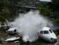 22일(현지시각) 온두라스의 통콘틴 국제공항에서 착륙 도중 활주로에서 추락한 소형 비행기에 소방대원이 물을 뿌리고 있다. 승무원과 탑승객들은 모두 무사히 구조된 것으로 알려졌다.