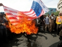 미국 트럼프 대통령의 핵합의 탈퇴에 반대해 이란 테헤란에서 열린 시위 도중 이란인들이 미국 국기를 태우고 있다.