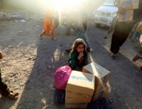 시리아 락까에서 도망친 한 아이가 락까에서 55km 떨어진 타바카에 있는 임시 캠프에서 유니세프에서 보낸 인도 구호상자 뒤에 앉아있다.