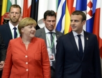 유럽연합(EU) 28개 회원국 정상은 브뤼셀에서 이틀간 열린 정상회의를 마치면서 군사안보 공조를 강화하고, 미국의 이탈 움직임으로 위기를 맞은 자유무역과 파리 기후협약을 견지하고 이행하기로 합의했다. 사진은 국제 무대에서 유럽 최고의 짝궁으로 떠오른 앙겔라 메르켈(왼쪽) 독일 총리와 에마뉘엘 마크롱 프랑스 대통령이 이야기하...