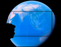 실제 지구를 보는 것과 비슷한 느낌을 주는 구글어스의 새로운 버전을 뉴욕의 휘트니 미술관에서 발표중 인 모습이다