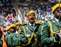 아프리카 대륙 중앙 남부에 있는 짐바브웨에서 독립 기념일 축하 행사 중 군인들의 경호퍼레이드 모습이다