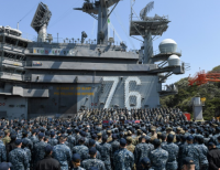 일본 요코스카 미 해군 기지에 있는 항공 모함에서 마이크 펜스 미국 부통령이 미국,일본 장병들에게 연설중인 모습이다