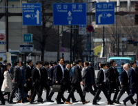 일본의 도심의 중심 도쿄 거리에서 양복을 차려 입은 직장인들이 도보를 횡단하고 있다