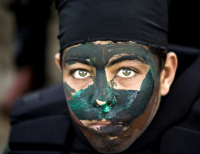 하마스 보안군과 가자 지구 내무부 하마스 내각 및 교육부가 주최한 군사 학교 졸업식 에서 팔레스타인 학생들은 졸업식에서 얼굴에 칠을 하고 졸업식을 올리고 있다.