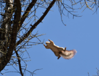 화창한 날에 우크라이나 수도 키예프의 중심에 하늘을 날고 있는 하늘다람쥐 모습이다