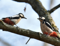독일 남부의 뭔헨 근처에 작은 마을의 정원에서 두마리의 딱따구리가 나무가지에 앉아 있는 모습이다