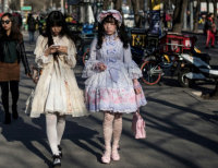 베이징에서 코스프레 드레스를 입은 여성 두명이 거리를 걷고 있다