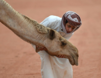사우디 아라비아의 한소년은 리야드 동쪽으로 약150km 떨어진 루마에서 낙타와 사진을 찍고 있다