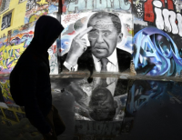 모스크바 페인팅벽에 세르게이 라브 로프 러시아 외무 장관의 초상화 페인팅
