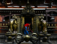 네팔 불교 카트만두 근처의 더르바르 광장에 있는 황금사원을 한여성이 청소중 이다