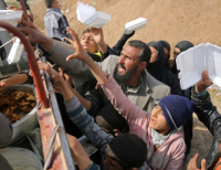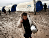 이라크의 난민 캠프에서 가족들을 위해 구호식품을 받고 있다