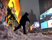 뉴욕의 타임스퀘어 에서 쌓인 눈을 치우고 있다