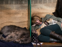 세계에서 가장 큰 개 미인대회에 참여하기 위해 버밍엄에서 자고 있는 한 여성의 모습이다