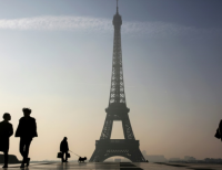 파리의 에펠 탑 근처 인근의 광장을 산책하고 있는 사람들의 모습이다