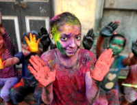 힌두교 축제 기간동안 서로에게 색안료를 던지며 축제를 즐기는 모습이다