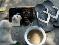 타밀나두 첸나이의 거리에서 강아지를 앞에 두고 면도 하고 있는 노숙자