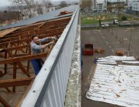 초등학교의 한 직원은 폭풍 제우스가 통과한 후 손상된 건물을 살펴보고 있다