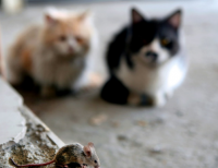 쿠웨이트에서 쥐를 보고 있는 두마리의 고양이