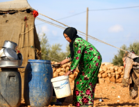 시리아 난민 캠프에서 한 여성이 식수로 사용할 물을 받고 있다.