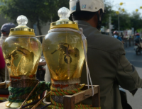 베트남 호치민시에 판매를 위해 전갈이 포함된 술을 오토바이에 싣고 운반 중이다.