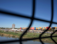 미국과 멕시코 사이의 국경에 다리에서 라레도, 텍사스,의 도시가 보인다