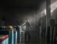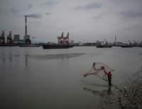 상하이 석탄 발전소 근처의 황푸 강에서 그물 낚시 하는 모습이다.