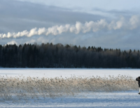 핀란드 라티의 마을 근처 얼어 붙은 호수에서 걷고 있다