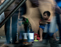 필리핀 소년이 자신의 강아지와 함께 마닐라 거리에서 구걸하는 모습이다.
