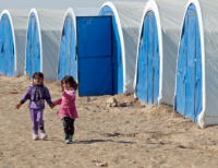 이라크 소녀는 IDP 캠프에서 손을 잡고 산책 하고 있다.