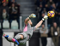팔레르모의 골키퍼인 조셉 포사브가 이탈리아 세리에 A 유벤투스 축구 시합에서 공을 쳤다