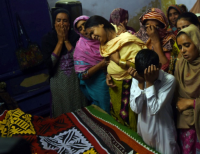 수피 신사에서 자살 폭탄 테러로 13세의 희생자 관 앞에서 파키스탄 가족이 통곡하고 있다