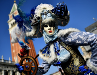 베니스 카니발에 한 참가자가 화려한 카니발 복장을 하고 마스크를 착용한 모습이다
