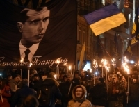 우크라이나 키예프에서 민족주의자조직(OUN) 정치인 스테판 반데라의 탄생 108주년을 기념해 행진을 하고 있는 사람들.