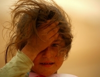 시리아-터키 국경인 알 마부루카(al-Mabrouka)의 한 난민캠프에서 시리아 여자 아이가 바람에 눈을 가리고 있다.