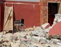 시리아 반군지역에 공습이 지나간 후 무너진 건물 잔해들 사이에 휠체어가 서 있다. 터키군은 25일(현지시간) 터키 남쪽의 이라크 북부 및 시리아 북동부에 소재한 쿠르드족 반군 지지를 공습했다고 밝혔다. 터키군은 쿠르드 반군 세력들이 요원들과 무기를 터키로 몰래 들여오는 것을 막기 위한 조치라고 설명했다.