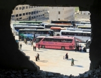 시리아 정부와 반군의 합의에 따라 봉쇄지역 4곳에서 민간인과 반군들을 대패시키기 위한 공동작전이 시작된 가운데 친정부 마을인 푸아와 카프라야 지역 주민들이 알레포 지역으로 향하기 위해 버스에 탑승하고 있다.