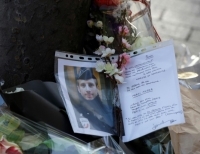 프랑스 파리 샹젤리제에서 총격 테러가 발생한 현장에서 사망한 경찰관을 애도하기 위한 꽃과 편지가 놓여있다.