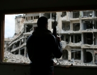 전투로 심하게 손상된 시리아 남부 다라(Daraa)의 한 건물에 반군 대원이 유리 없는 창문을 바라보고 서 있다.