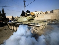 이라크 군의 T-72 탱크가 티그리스 강 제4 다리 부근의 IS 군과의 전투 도중 모술의 동부와 서부를 연결하는 최전방으로 향하고 있다.
