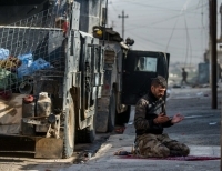 이라크 특수부대 소속인 한 군인이 모술의 카르클락 지역 근처에서 도시 탈환 작전이 시작하기 전 군사 차량 옆에서 기도하고 있다.