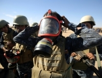 모술 탈환을 위해 공격을 준비하고 있는 이라크 경찰이 모술 남부에 위치한 군사기지에서 가스 마스크를 쓰고 있다.