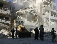 시리아 알레포에서 정부군의 폭격으로 파괴된 건물 잔해를 치우고 있는 모습. 임시 휴전이 깨진 후, 지난 주말 동안 정부군은 알레포에 200여 차례의 공습을 가했다.