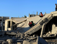 시리아 남서부 다라(Daraa) 반군 지역 도시의 파괴된 건물 잔해를 타고 노는 아이들.