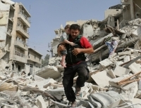 임시 휴전이 깨지고 다시 공습이 시작된 시리아 알레포에서 한 남성이 붕괴된 건물 잔해에서 어린 아이와 함께 대피하고 있다.