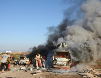 '화이트 헬멧'으로 알려진 시리아 민방위가 시리아 마을에서 도망치려는 사람들의 차량에서 화재가 발생하자 생존자를 찾고있다.