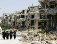 시리아 홈즈에서 파괴된 건물을 배경으로 걸어가고 있는 사람들.